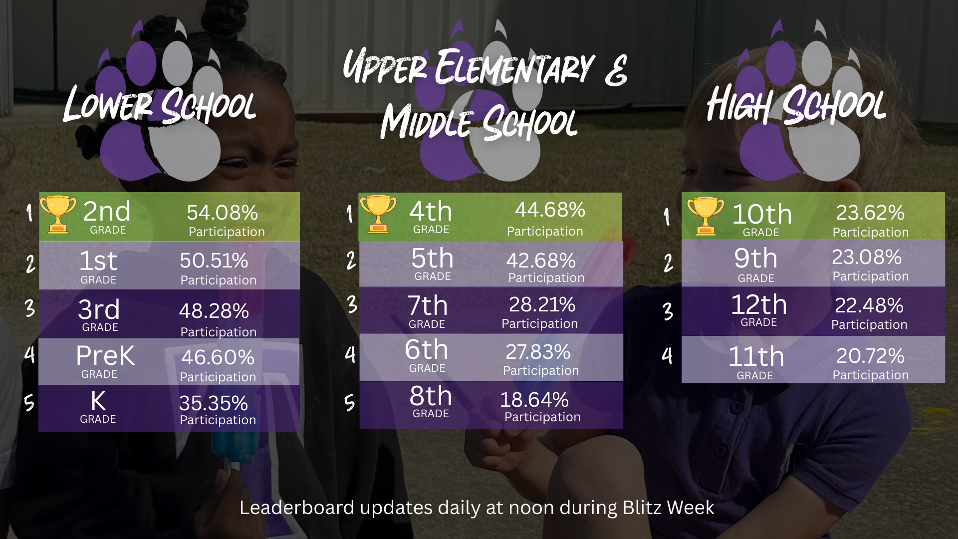 The highest participating grade for each school by Wednesday, 9/10, will win a special dress down day for their grade.